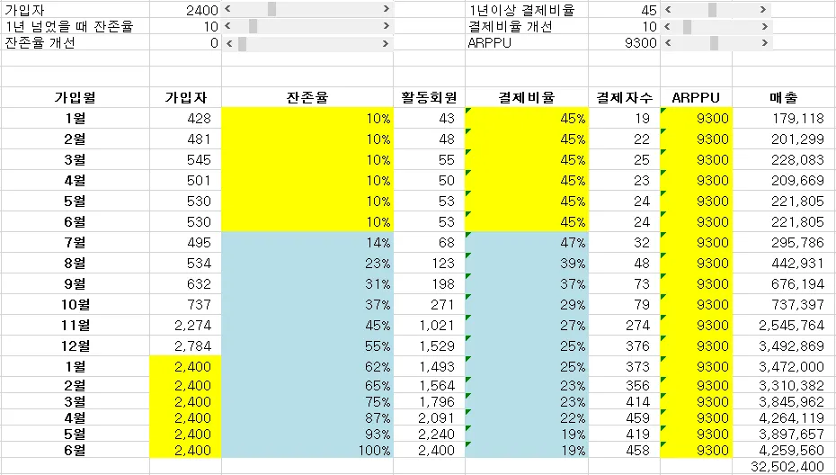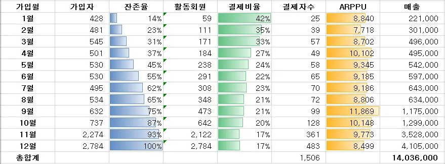 매출에 유의미한 변화가 있다면, 잔존율 or 결제비율 or ARPPU 중 무엇때문에 변화한 것인지 혹은 언제 가입한 사람이 특히 많이 결제했는지 등을 종합적으로 판단할 수 있음