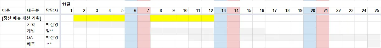 업무 구분 | 등급 | 소요일수 | 담당 여부 (기여도) |
